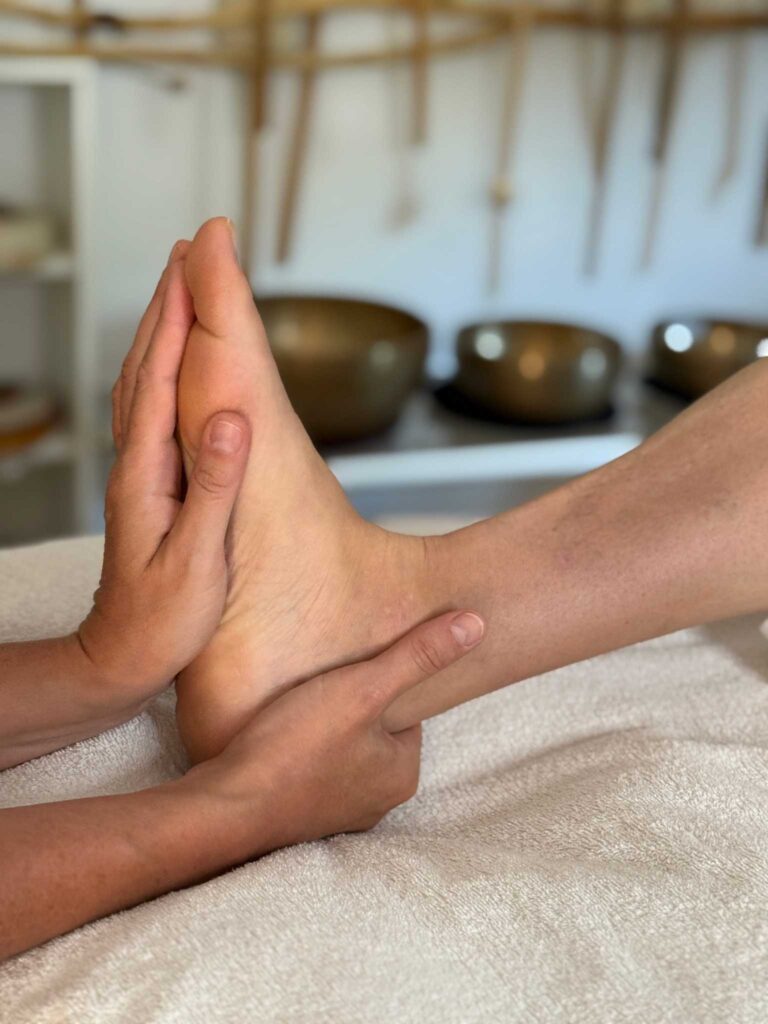 Ich zeige dir einfache Techniken, wie du mit deinen Händen auf sanfte Weise über die Füße den Körper und Geist entspannst